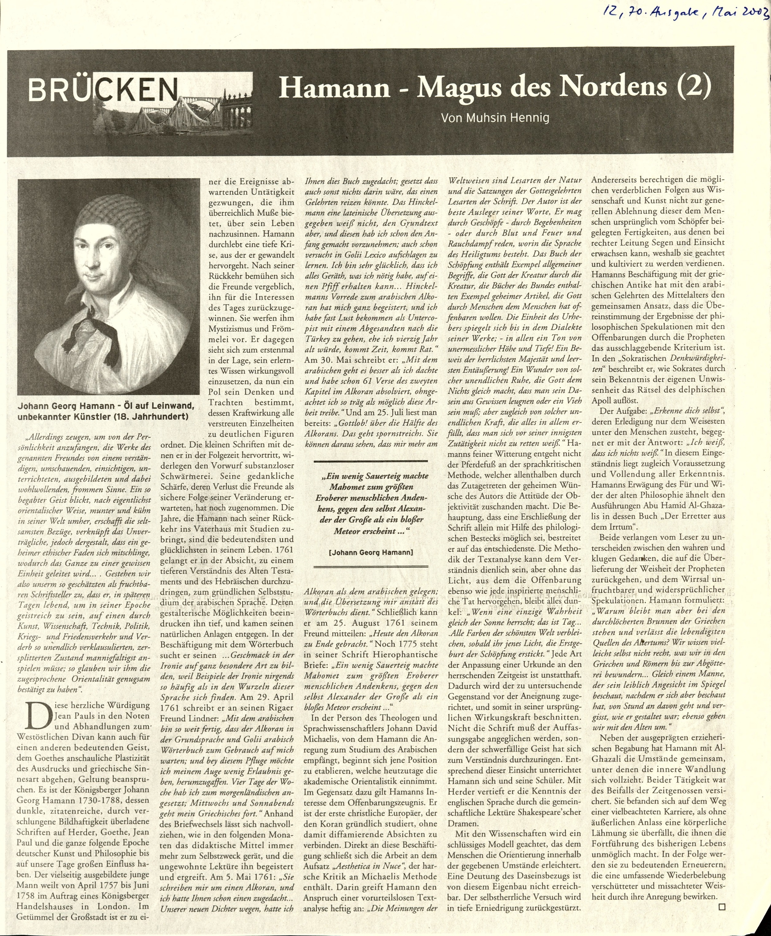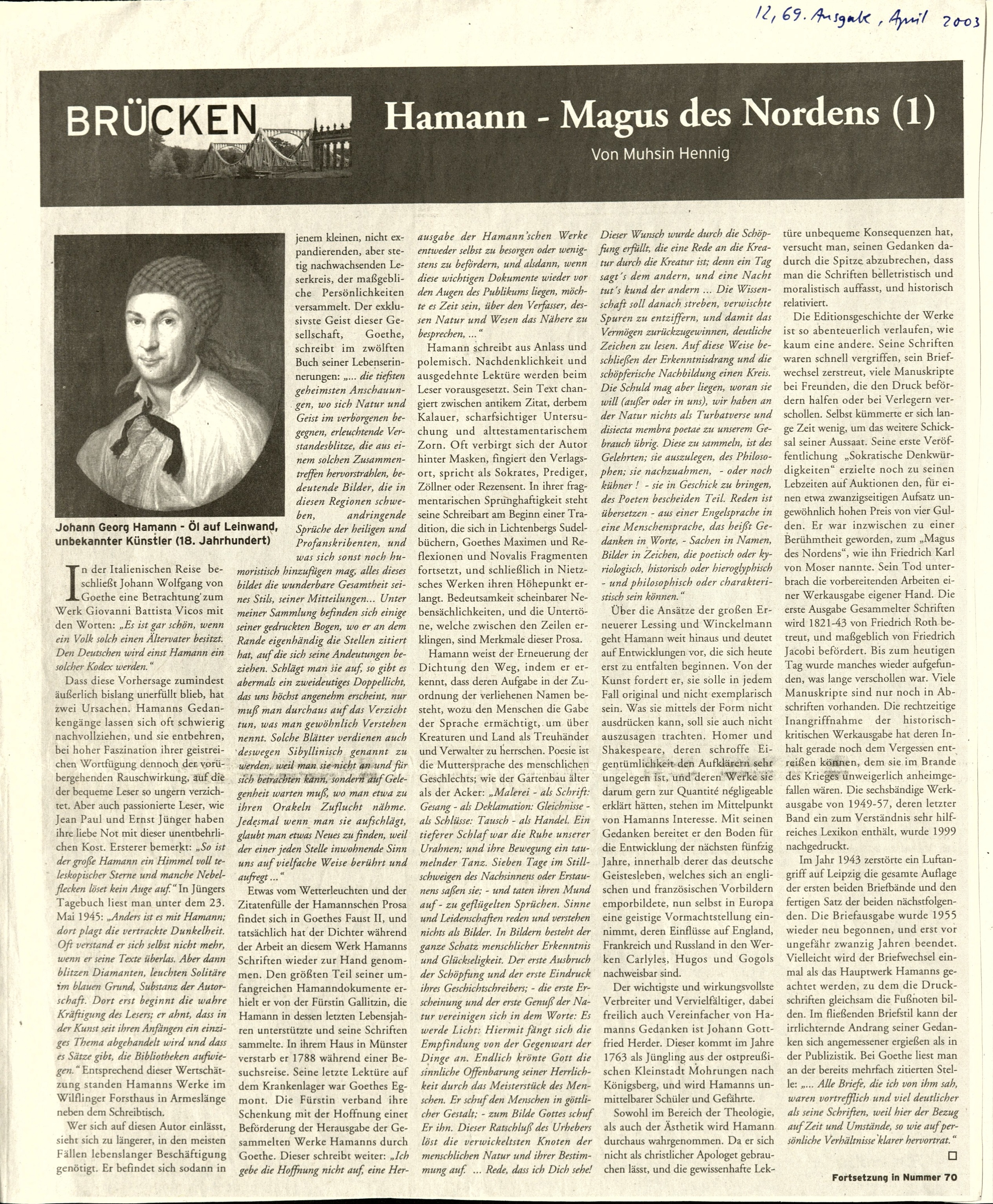 Nachwort In: Johann Georg Hamann. Schriften in bebilderten