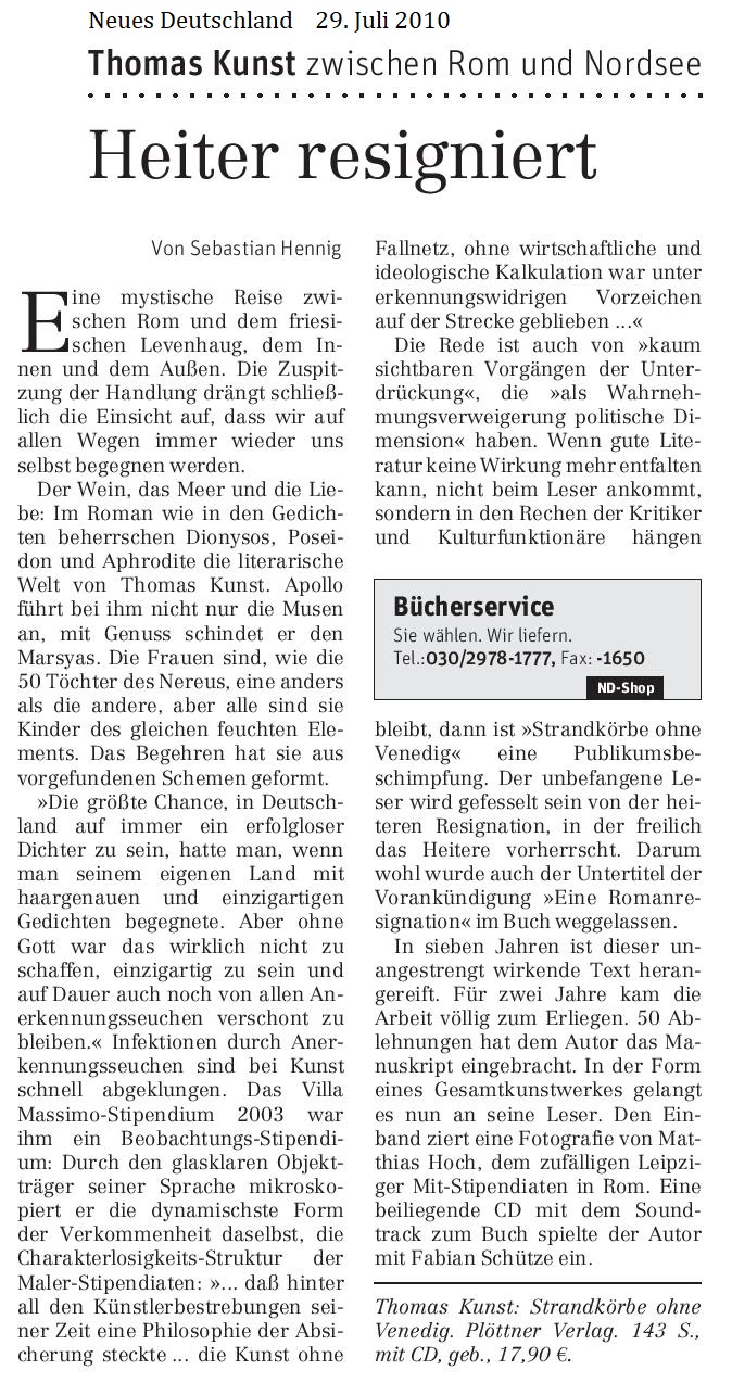 Dichters reine Hand. Thomas Kunst, Sonette und das Meer. Neues Deutschland. 26. März 2009